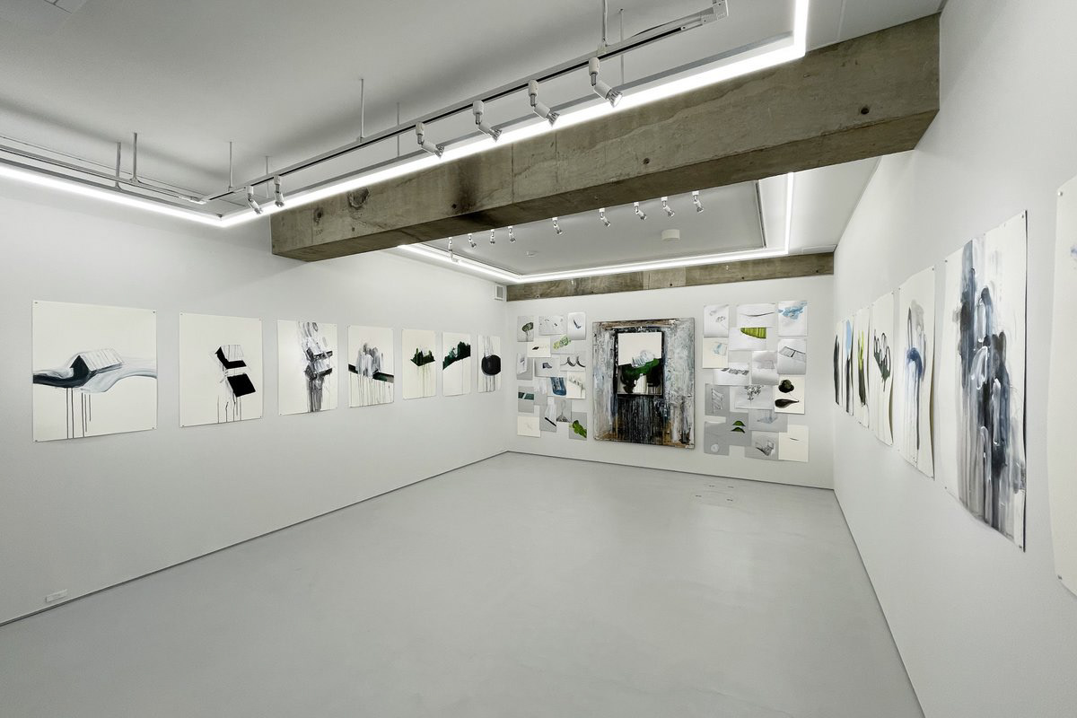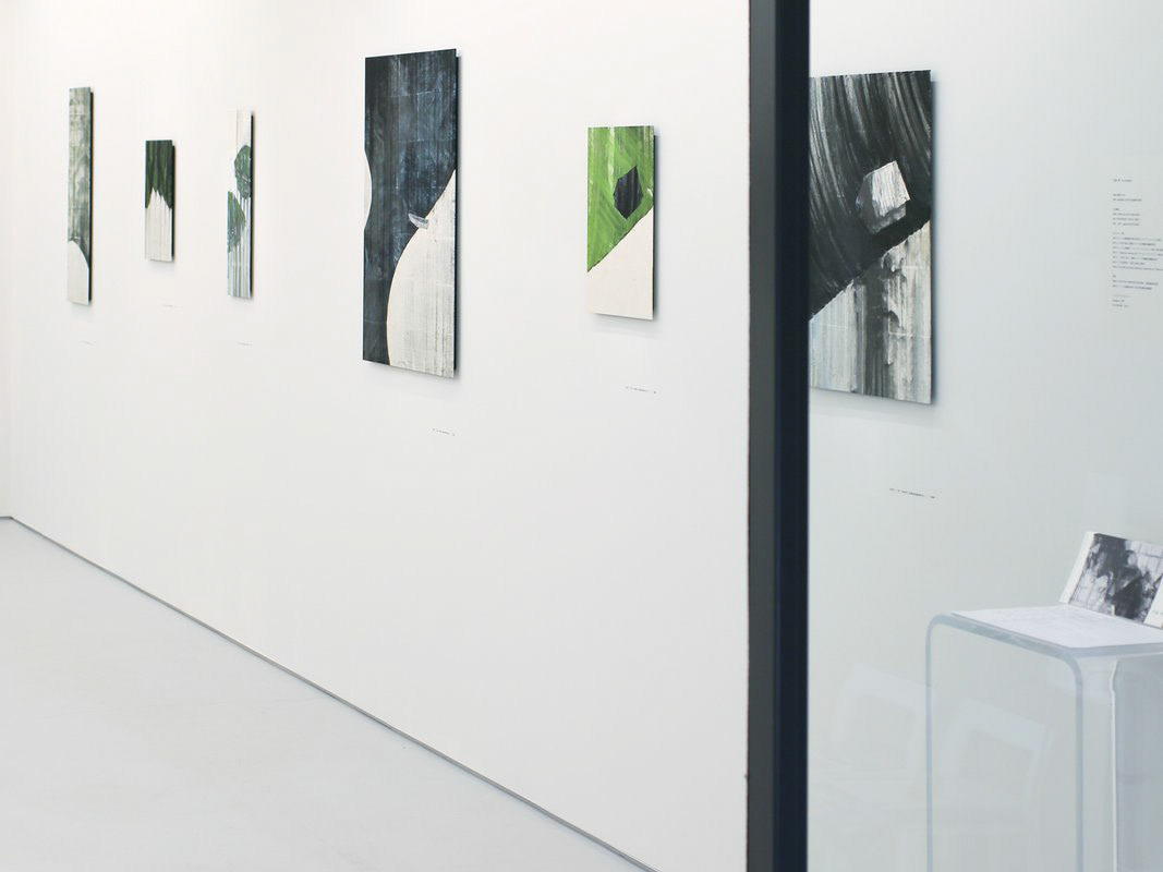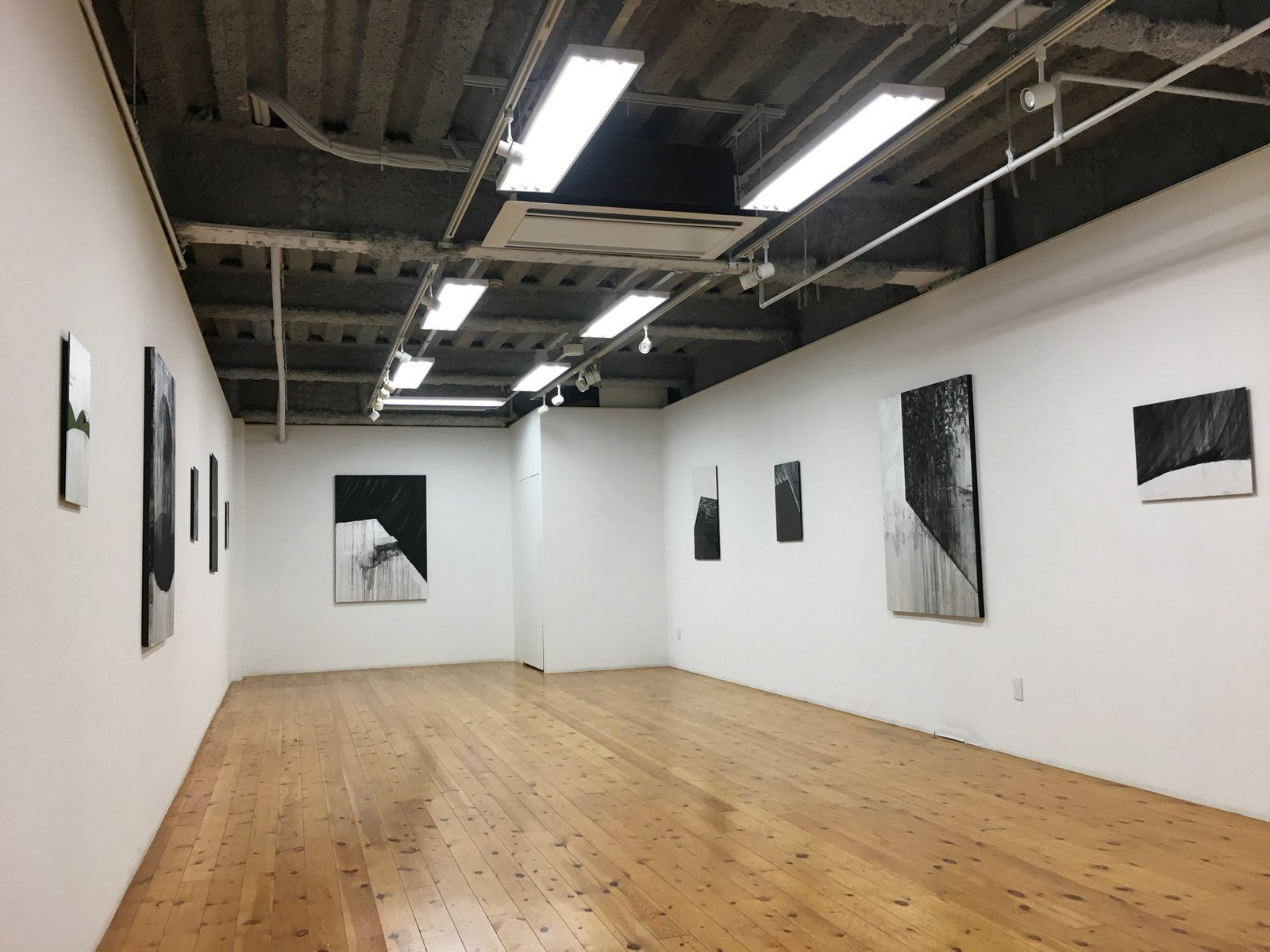 偶然できた絵具のにじみや垂れなども味方につけることで作為を超え、奥行きが生まれます。